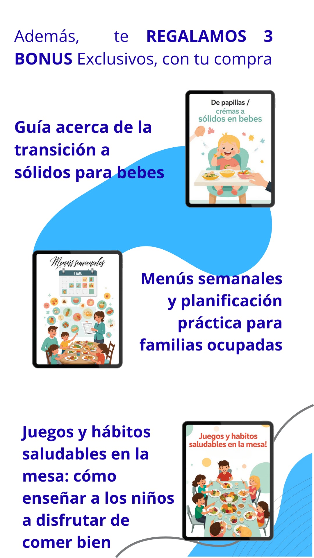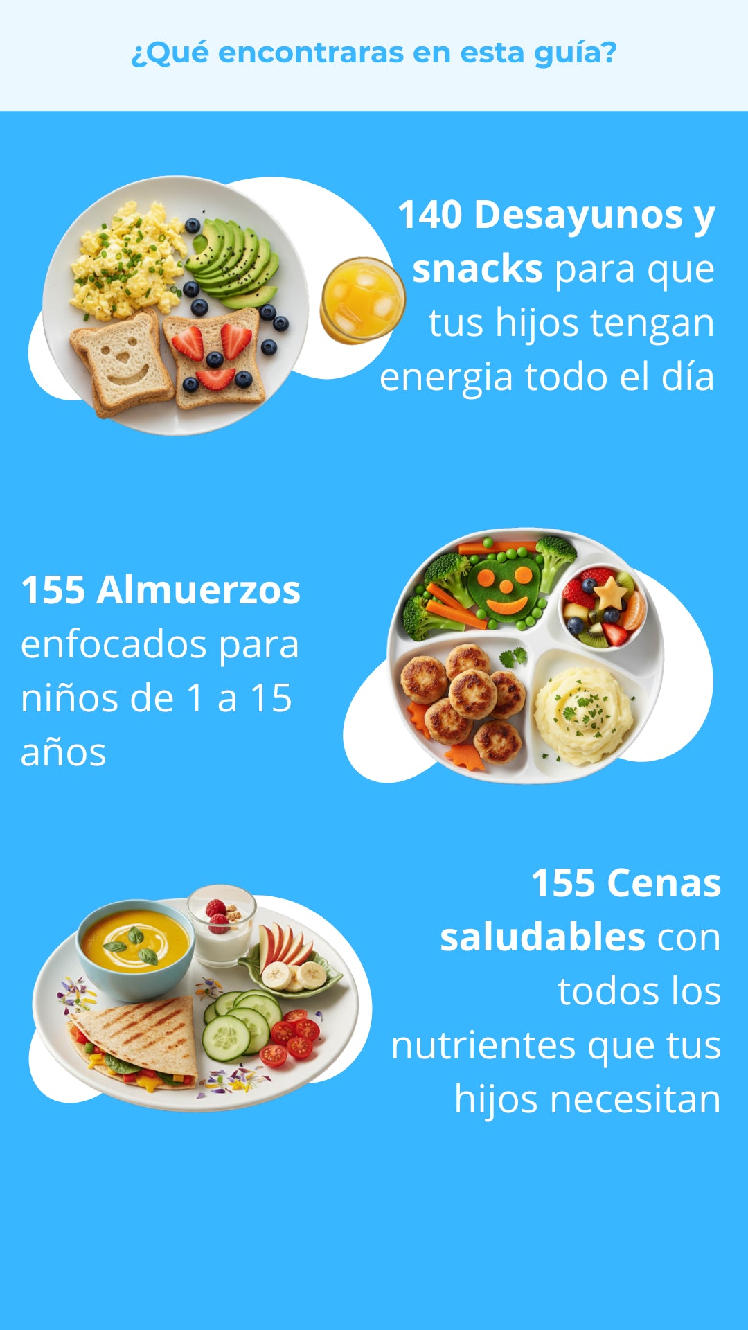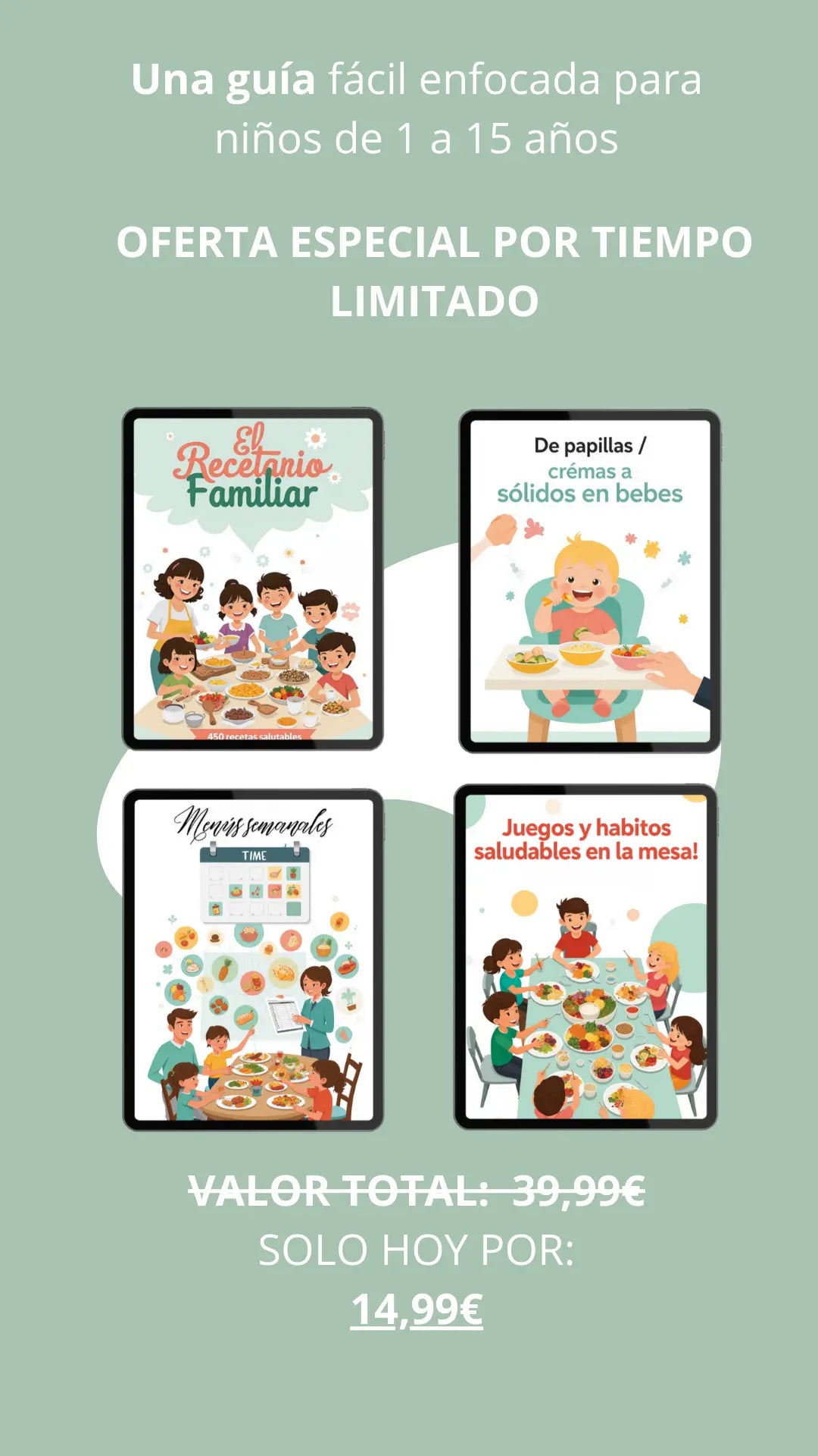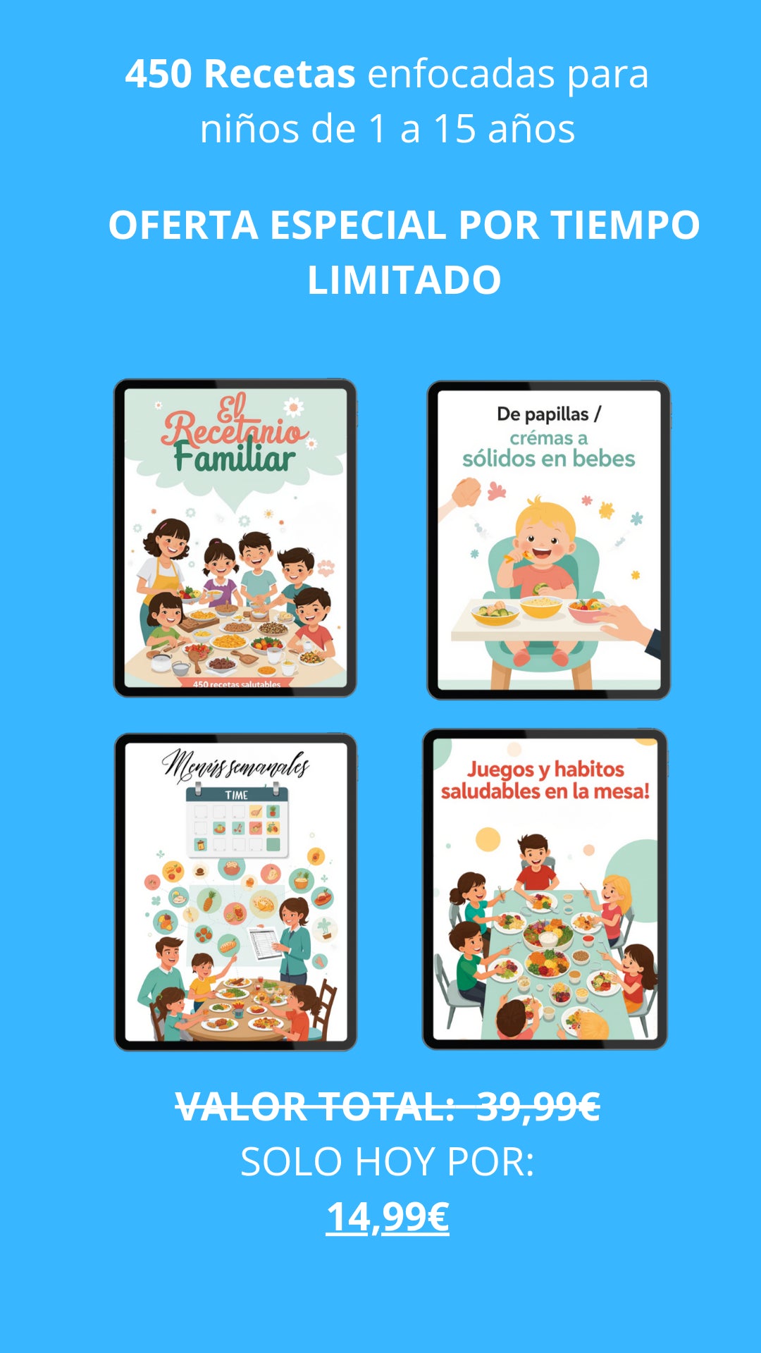 Un ebook en PDF con recetas familiares organizadas por edad, ideas de desayunos, comidas, cenas y lunchbox, sugerencias de raciones orientativas, y consejos para niños selectivos. Pago único de €14,99 y acceso sin caducidad.