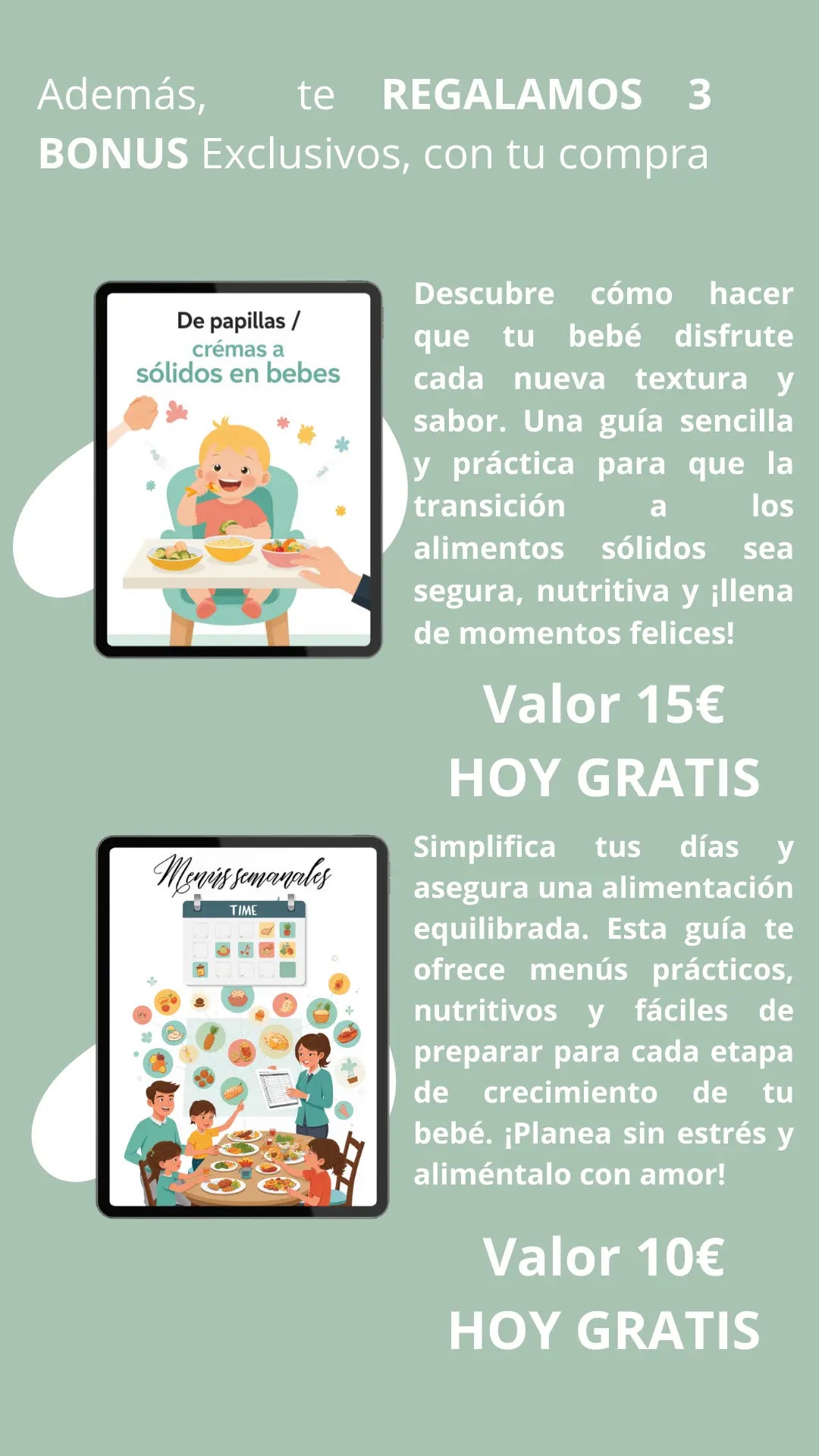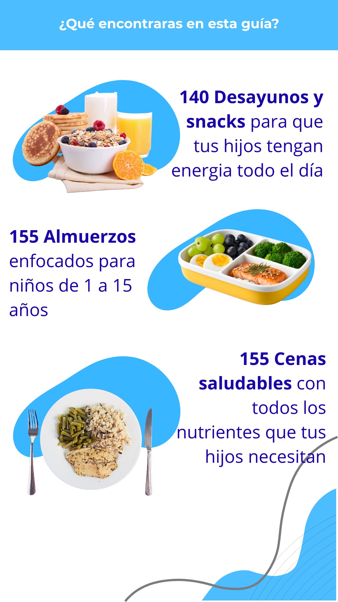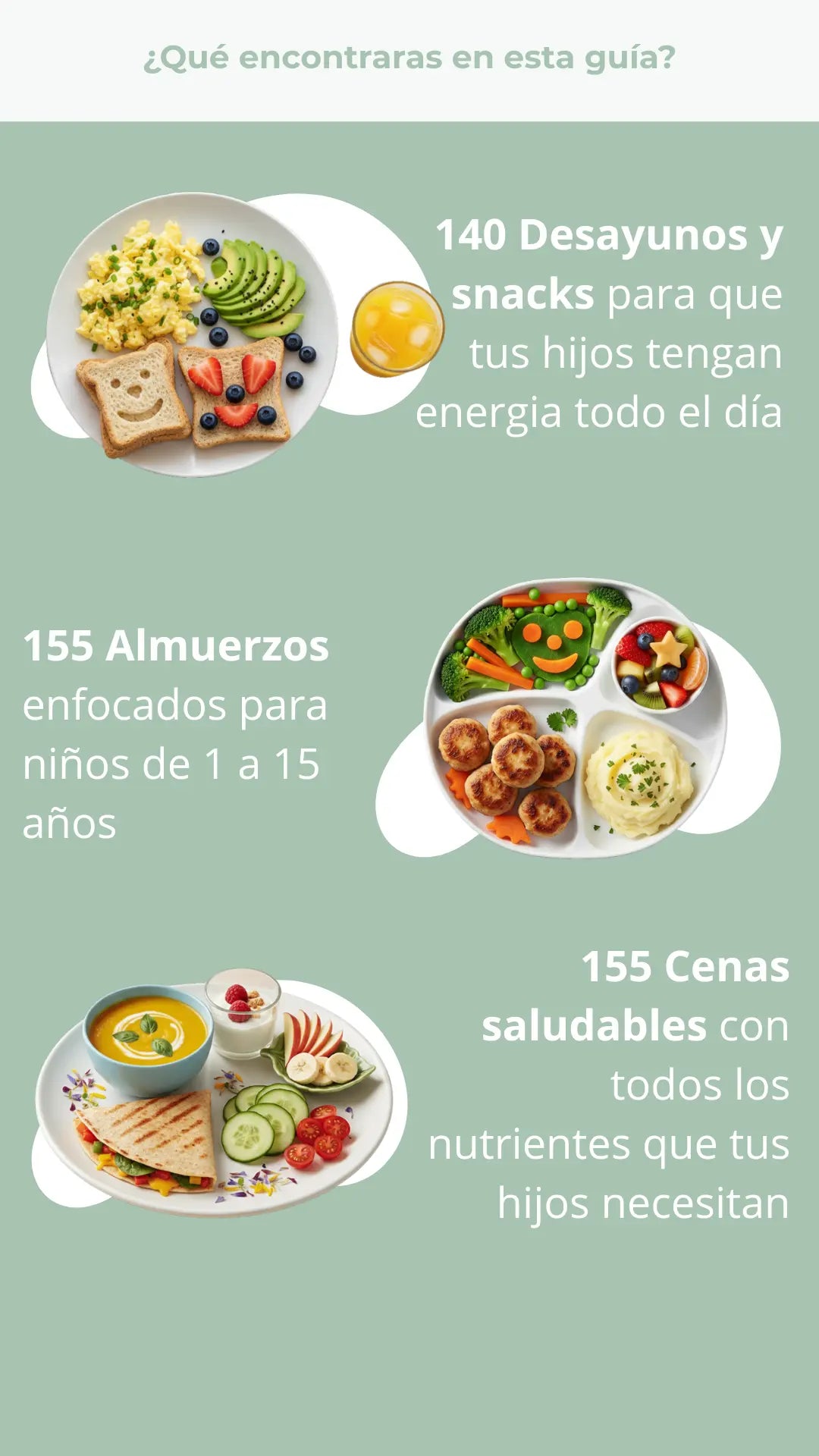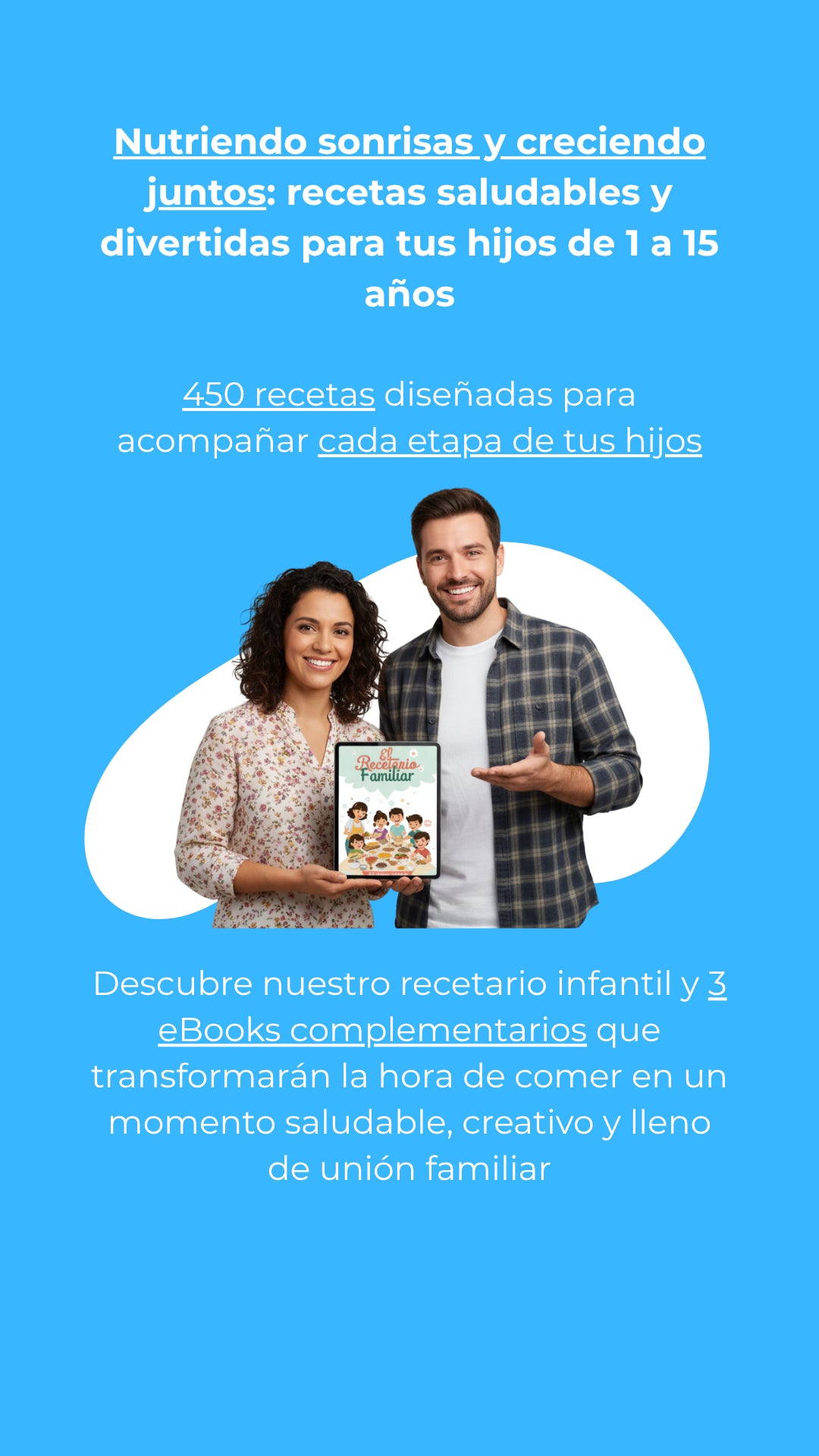 Un ebook en PDF con recetas familiares organizadas por edad, ideas de desayunos, comidas, cenas y lunchbox, sugerencias de raciones orientativas, y consejos para niños selectivos. Pago único de €14,99 y acceso sin caducidad.
