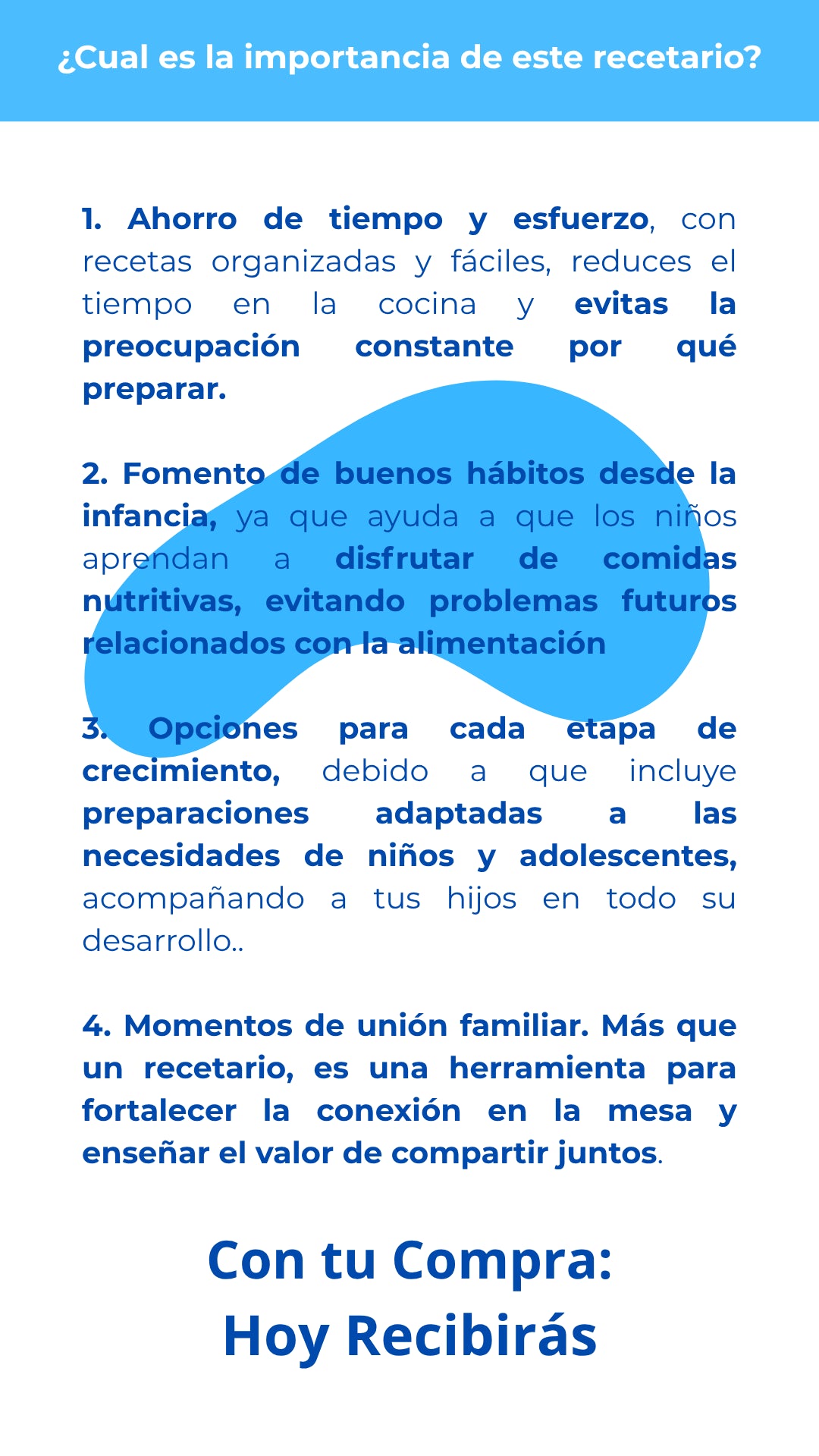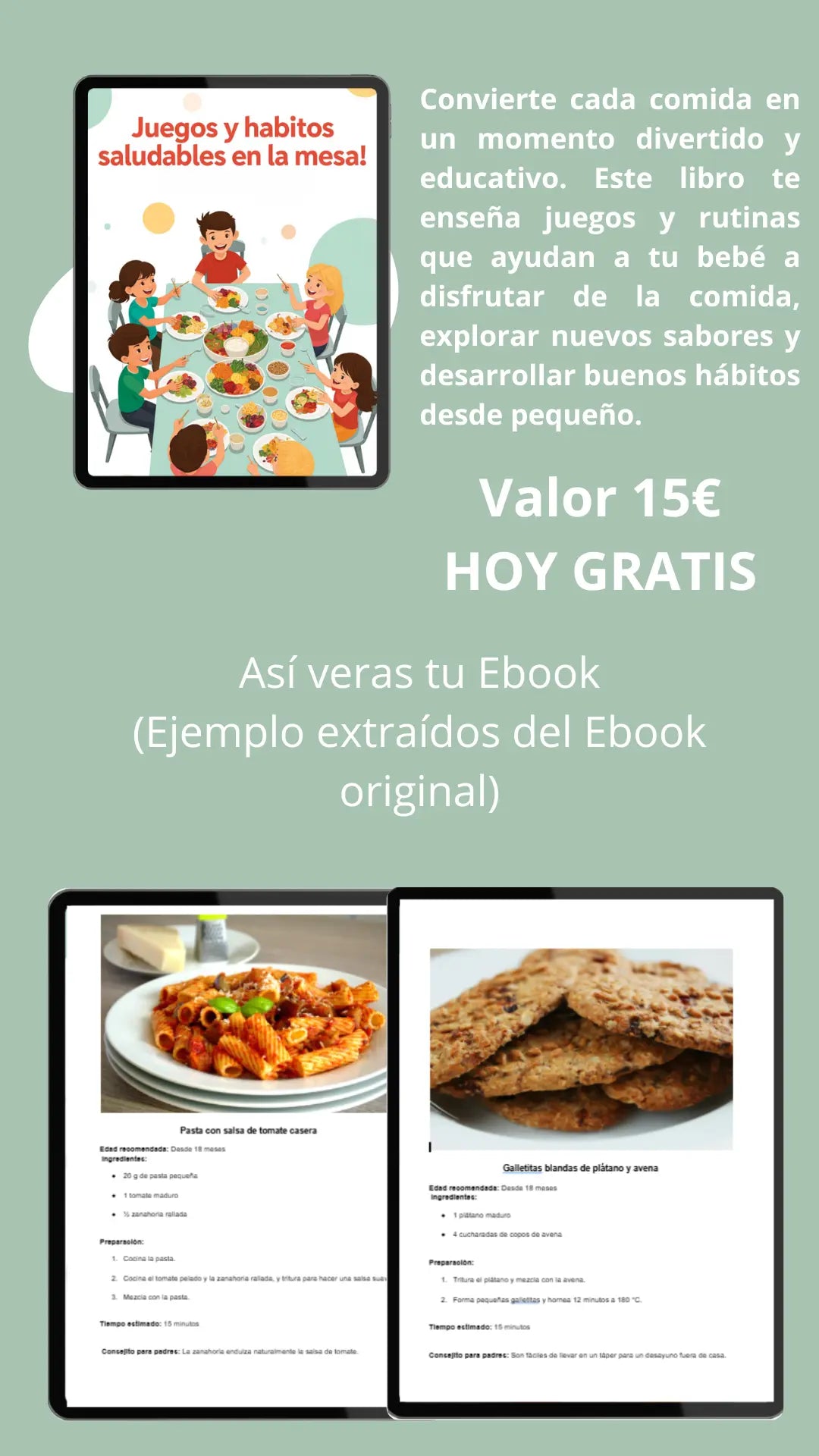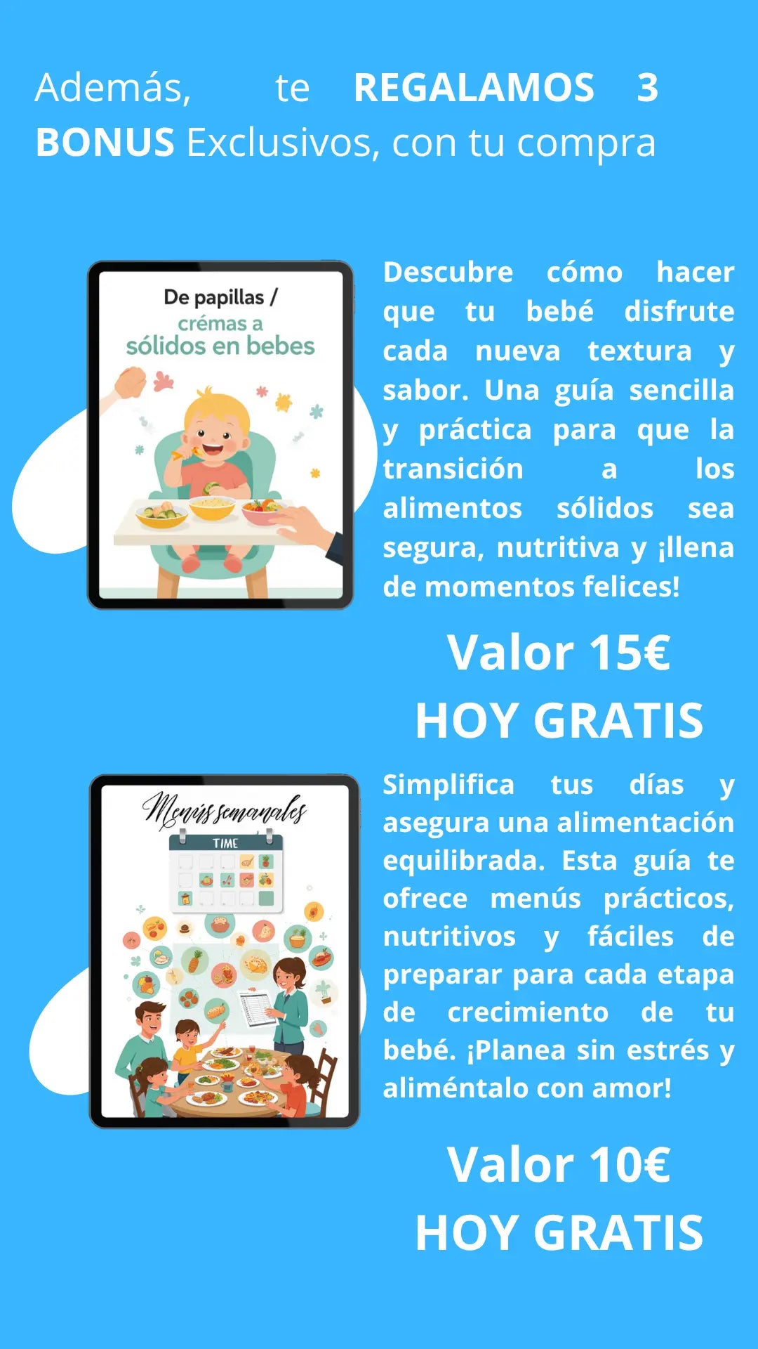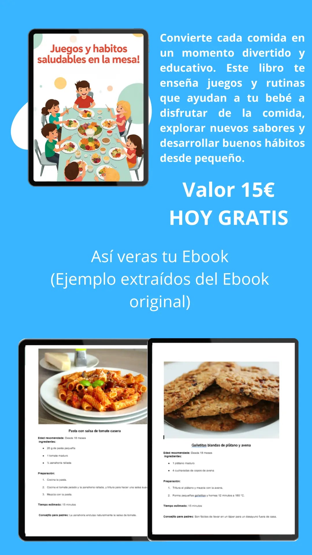 Un ebook en PDF con recetas familiares organizadas por edad, ideas de desayunos, comidas, cenas y lunchbox, sugerencias de raciones orientativas, y consejos para niños selectivos. Pago único de €14,99 y acceso sin caducidad.