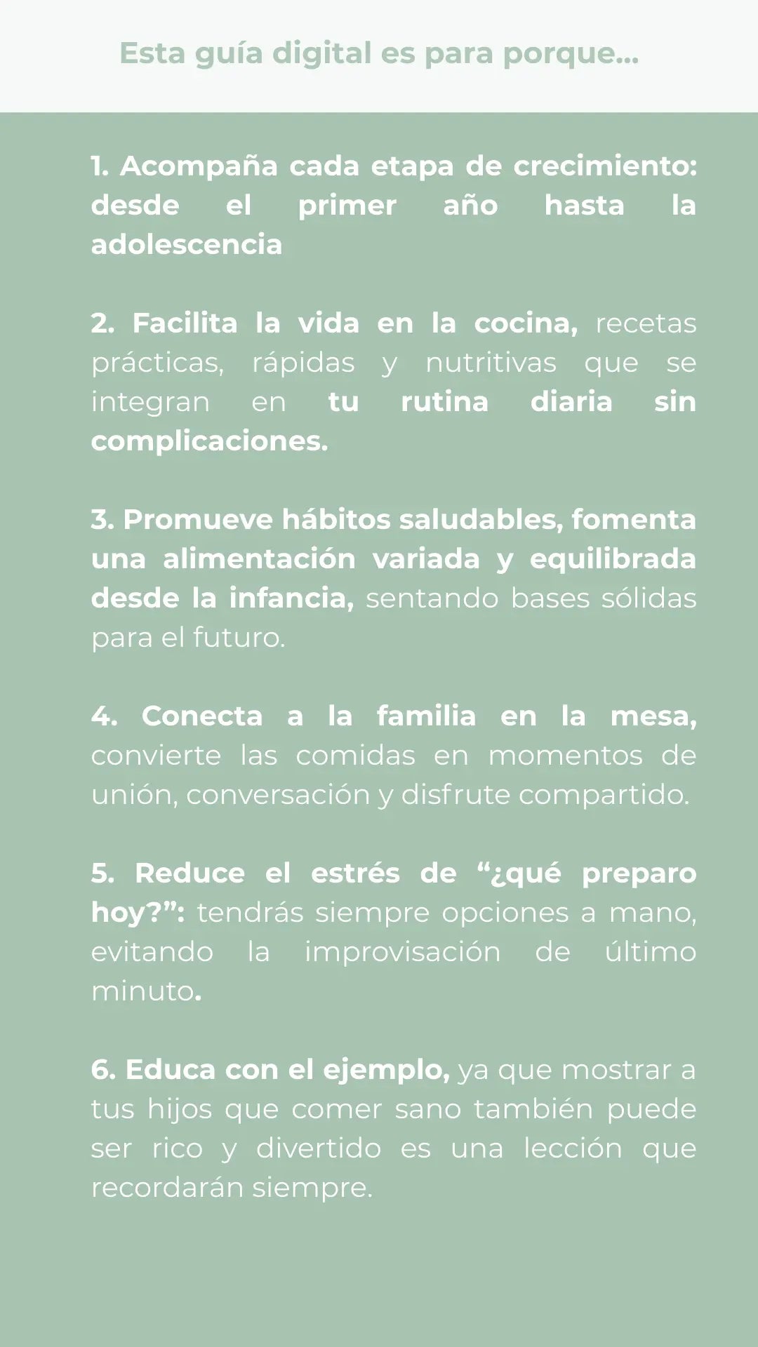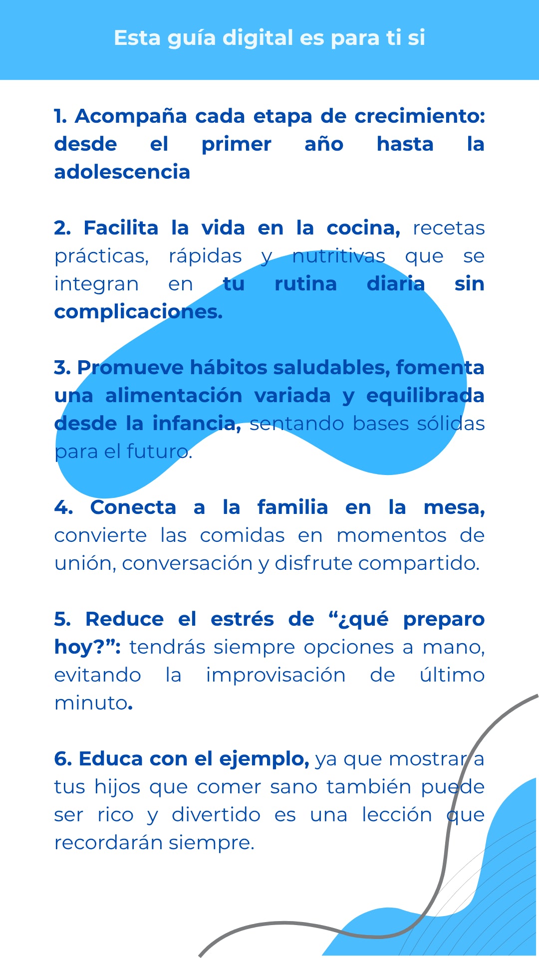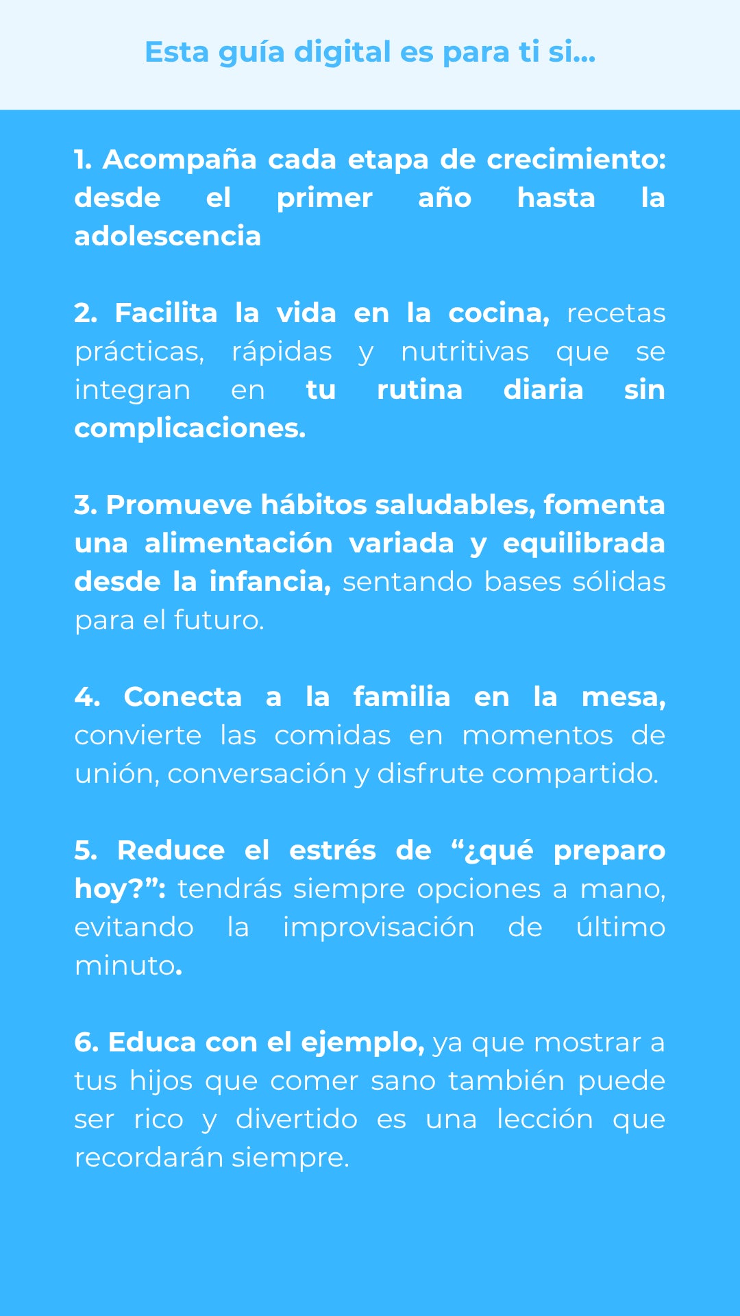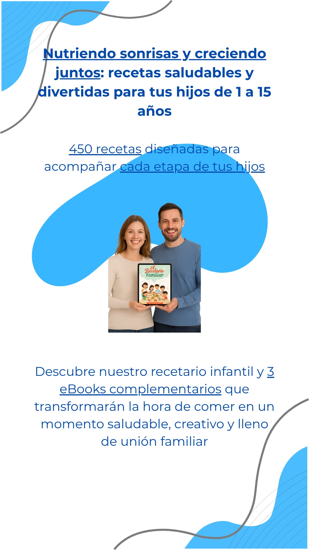 El recetario ofrece orientaciones y alternativas habituales, pero cada familia es diferente. Revisa cada receta y adapta ingredientes a tus necesidades. No constituye consejo médico; consulta a tu pediatra/nutricionista si lo necesitas.